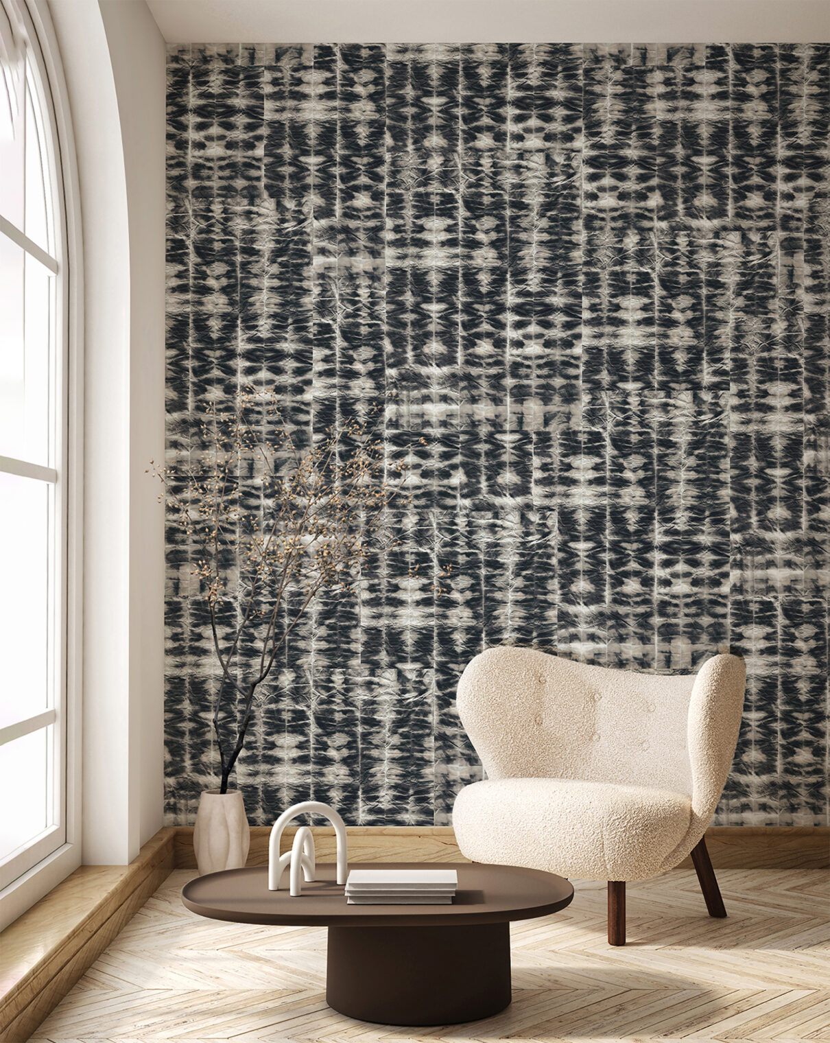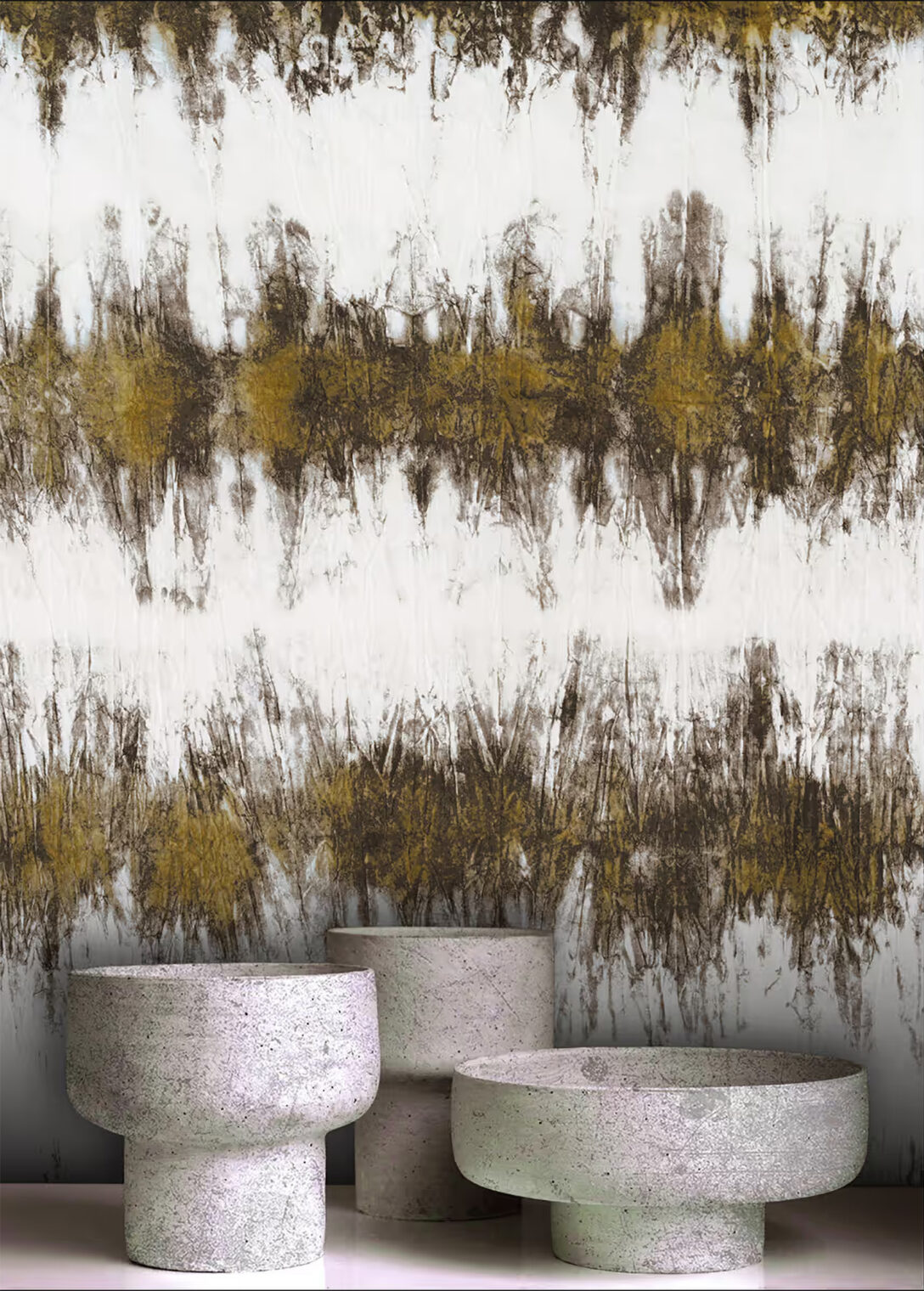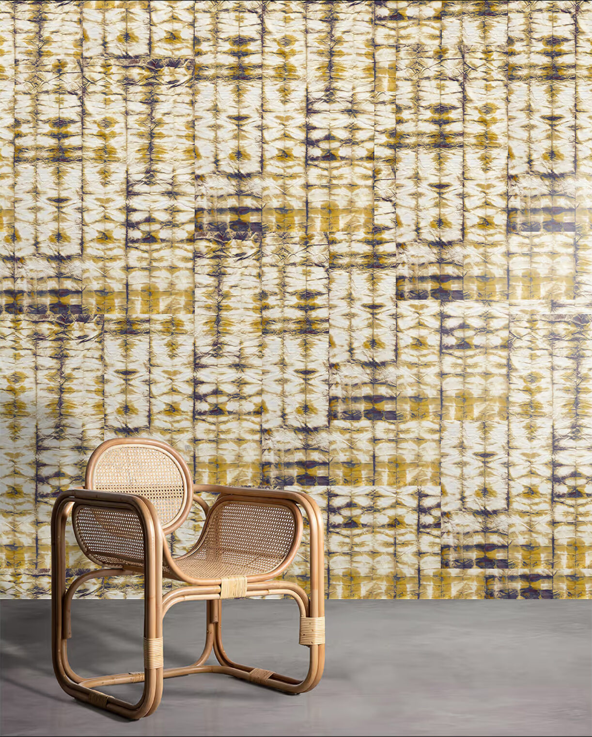 日本で11年過ごした中で出会った伝統的な絞り染めの技法にインスパイアされて制作。日本特有の紙を質感で選び、墨と天然顔料で染色したのち、さまざまな加工を施しながら、色の流れや奥行きを与えて作品が生まれています。
