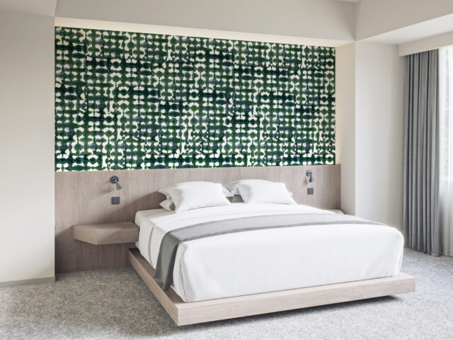 壁紙は日本で11年過ごした中で出会った伝統的な絞り染めにインスパイアされて制作。有機的な紙と自然を想起させる色が調和し、独自の解釈で日本の文化と美学をデザインに反映しています。