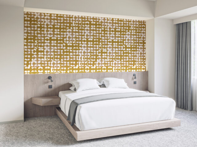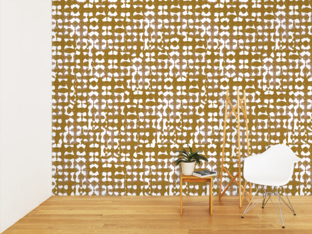壁紙は日本で11年過ごした中で出会った伝統的な絞り染めにインスパイアされて制作。有機的な紙と自然を想起させる色が調和し、独自の解釈で日本の文化と美学をデザインに反映しています。