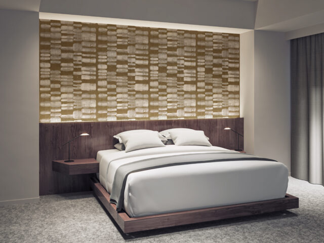 壁紙は日本で11年過ごした中で出会った伝統的な絞り染めにインスパイアされて制作。有機的な紙と自然を想起させる色が調和し、独自の解釈で日本の文化と美学をデザインに反映しています。