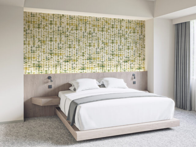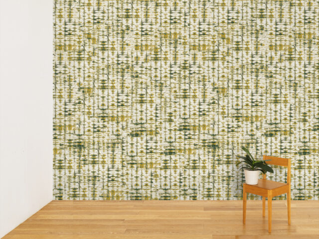 壁紙は日本で11年過ごした中で出会った伝統的な絞り染めにインスパイアされて制作。有機的な紙と自然を想起させる色が調和し、独自の解釈で日本の文化と美学をデザインに反映しています。